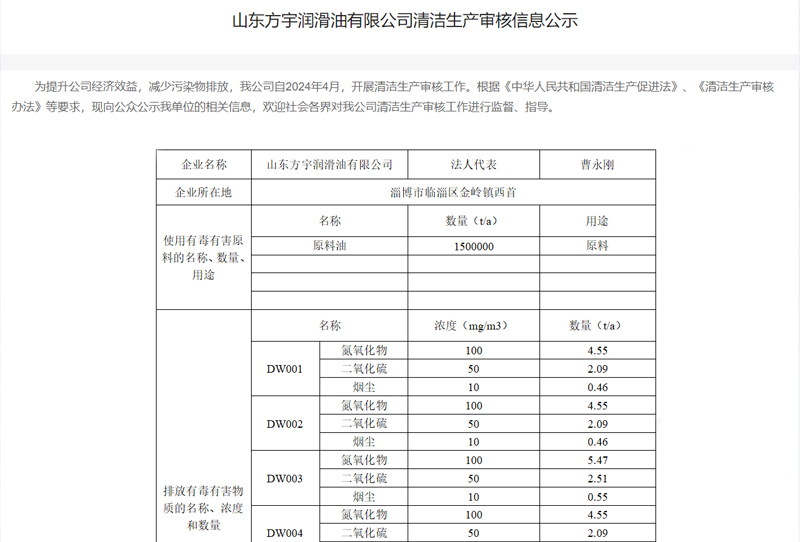 • 山東方宇潤滑油有限公司清潔生產審核信息公示